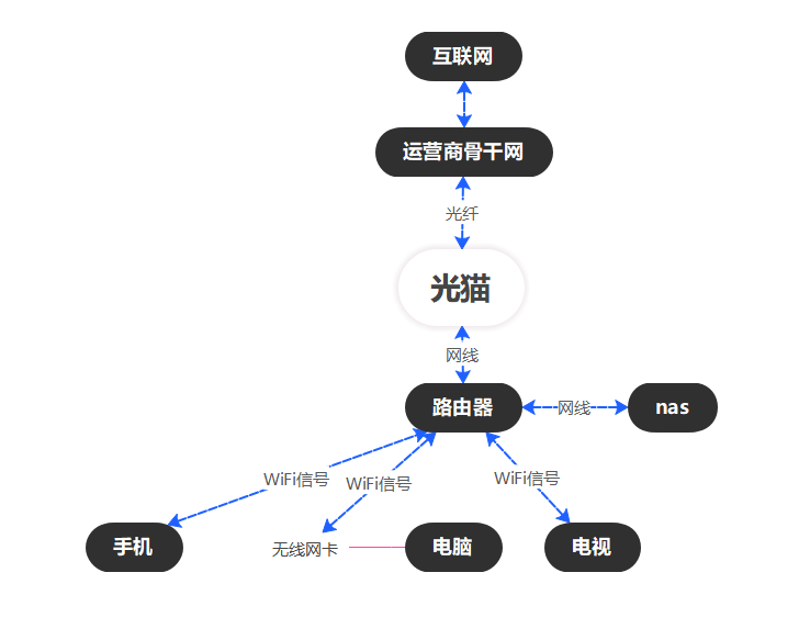 虽然光猫也可以产生WiFi信号,但是由于不是每家都会光纤入户,以及碍于光猫狗屎感人的性能,绝大多数家庭的网络链路应该是这样的: